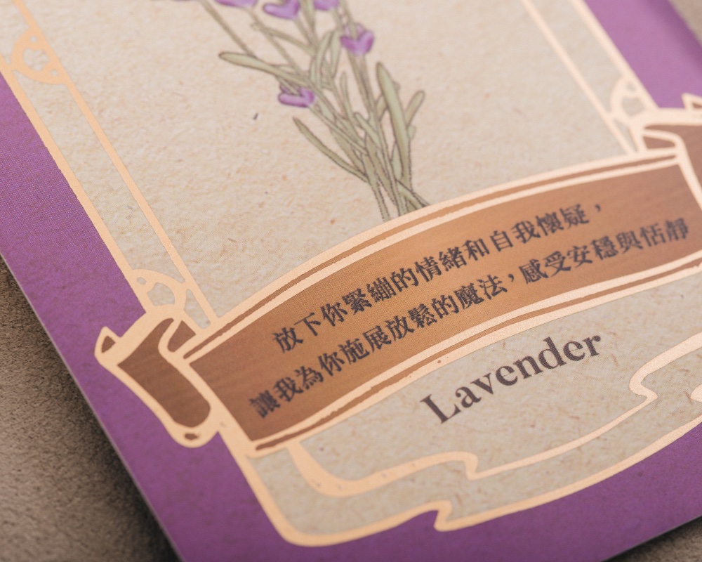結合了「人體七脈輪」與「彩虹能量」等知識運用,便可以發現植物療癒卡主要分為七大色調,藉由不同的顏色對應,每種色調的植物個性也大不同,收錄了雪松、甜橙、天竺葵、薰衣草等多種植被。而上頭的暖心話語,也為生活感到迷惘的人帶來了正能量。(每日一抽也是很療癒啊~)