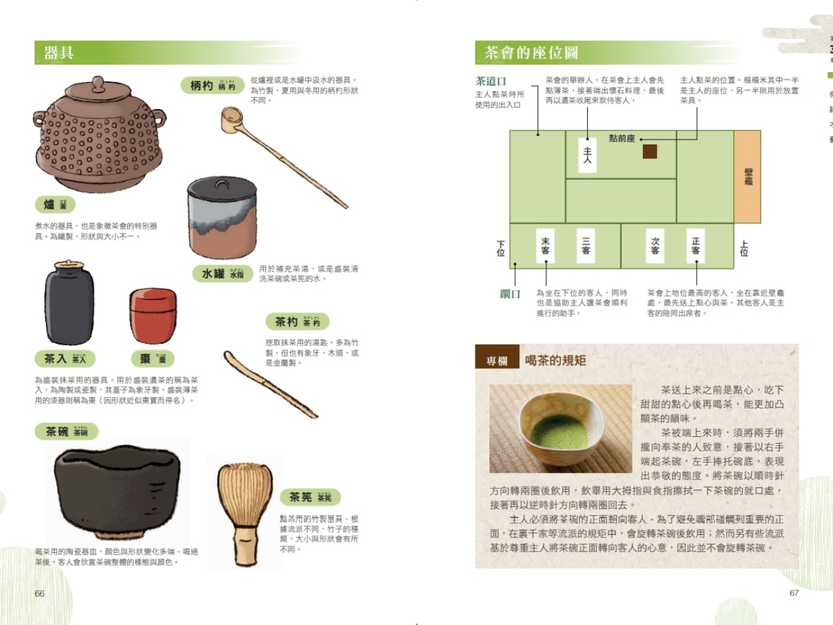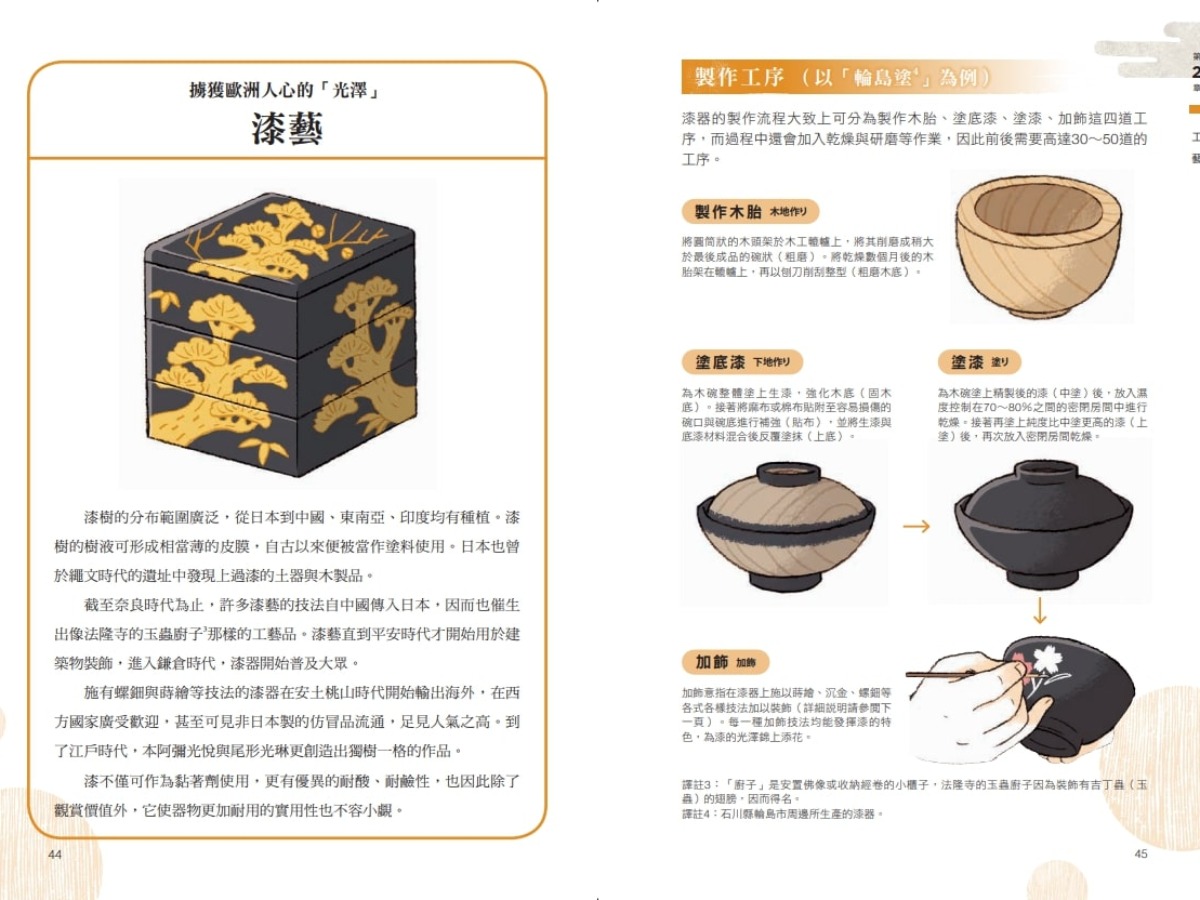為了網羅日本文化的各個面向,書中也分為七大章節:表演藝術、工藝、傳統才藝、藝術、節慶、武道、住居與生活用品,為讀者打下紮實的文化基礎並開闊不同的知識領域。