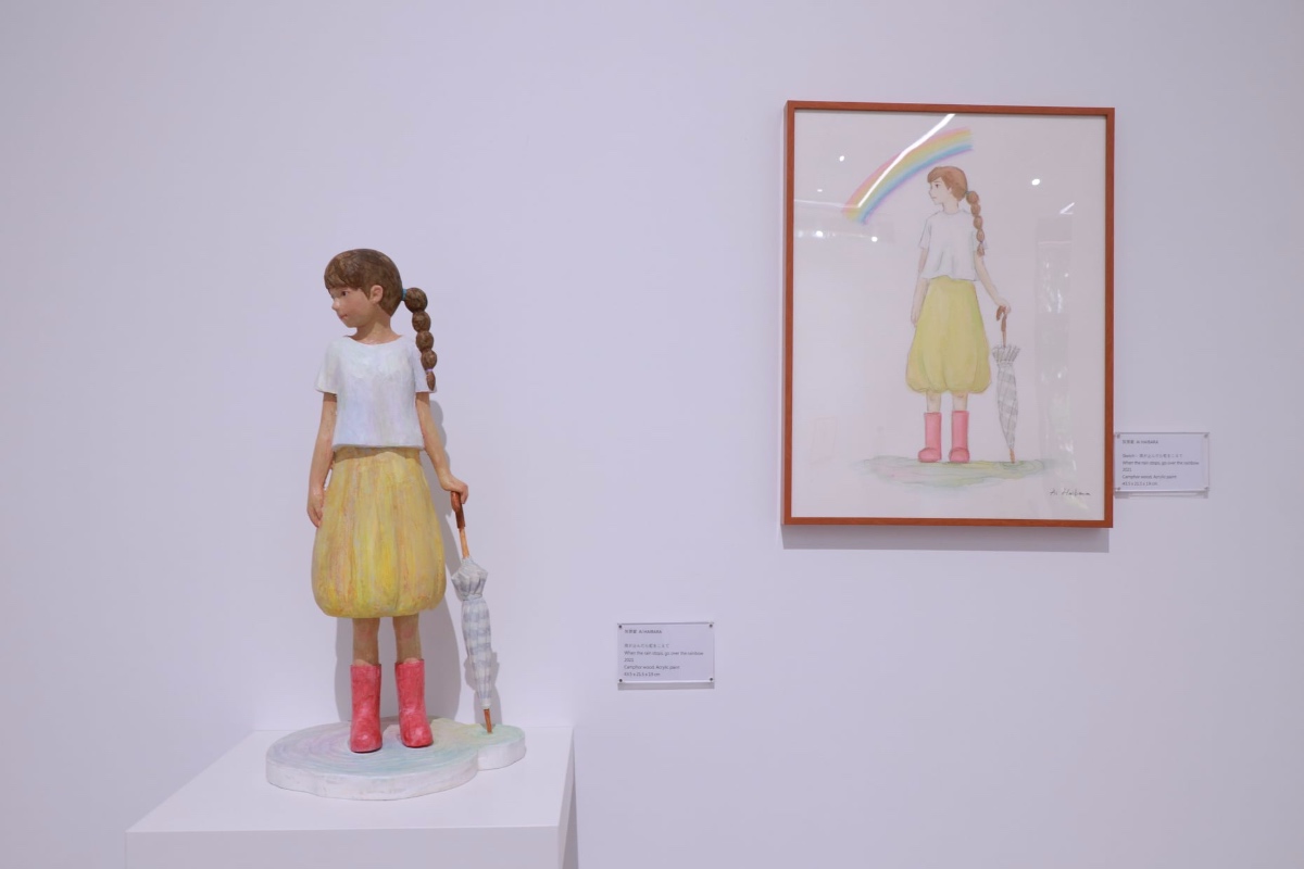 走進涅普頓畫廊,能立即望見不少矗立於展間的輕柔身影,可能是一把抓住流星的少女、帶有憂傷神情的呆萌雙胞胎、自帶光環的太陽女神等,皆透過灰原愛特有的雕刻技法與上色技巧,並結合異材質將各色人物生動呈現,不僅高還原插畫草圖,兩相對比的逗趣展示,想像如何從平面轉成立體的創作過程,也為靜謐展區捎來一股俏皮氛圍。
