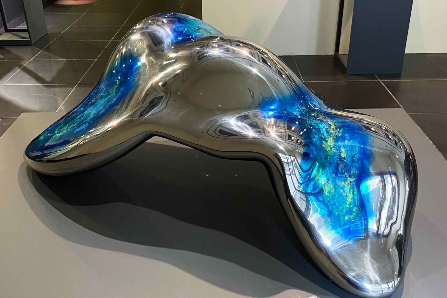 望向展場的那一刻,我便被〈凝〉所吸引,有著一只眼睛的外型,金屬光澤反射觀者的樣貌與心境,彷彿正被凝視著,等待確認彼此的存在。匆匆過路人映照其中,斑斕搖曳的倒影,也成為觀看此作品的樂趣。