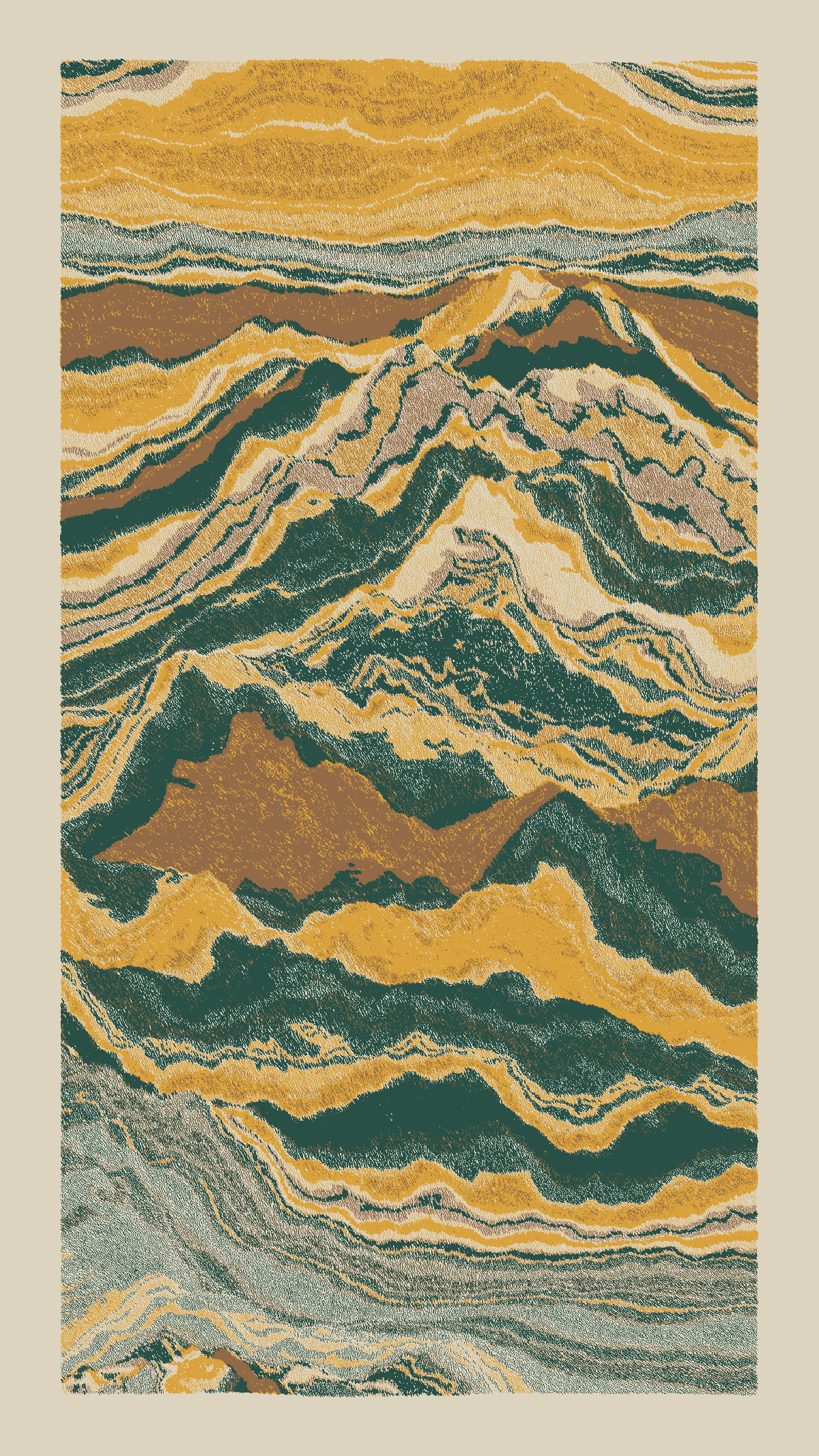 麥特・德洛里耶 Matt DesLauriers《子午線》是一件生成藝術作品,以許多微小的彩色筆觸形構出分層化的地形,揭示出此一多重宇宙中某種即逝而破碎的景象。以編碼指令的密集集合所發展出的演算法,機械性地逐漸編織出這些筆觸,編結出生成式的美景。軟體每一次的執行都會產生全新的構圖,與先前產生的其他版本都不同。