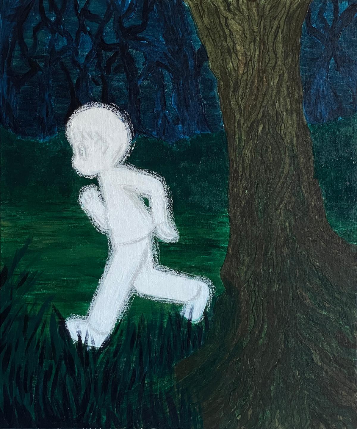 前一陣子為了八月快閃活動畫了以「消極男子的日常」為題創造出一系列的作品,開始嘗試了以油畫棒作畫,並期許能在畫面中安排元素使觀者好奇。平時作畫時,消極習慣三、四幅創作同時並進,並且不時回過頭調整,平衡彼此間的衝突感,常常是一週內在兩三幅畫作之間來回修改。確保同一系列中的幾張畫有任何的不和諧都是有意識的選擇。以「黑暗森林系列」為例,畫作中的角色以近乎留白的剪影形象呈現,輪廓周圍再以白色的油畫棒點壓出類似光暈的效果。