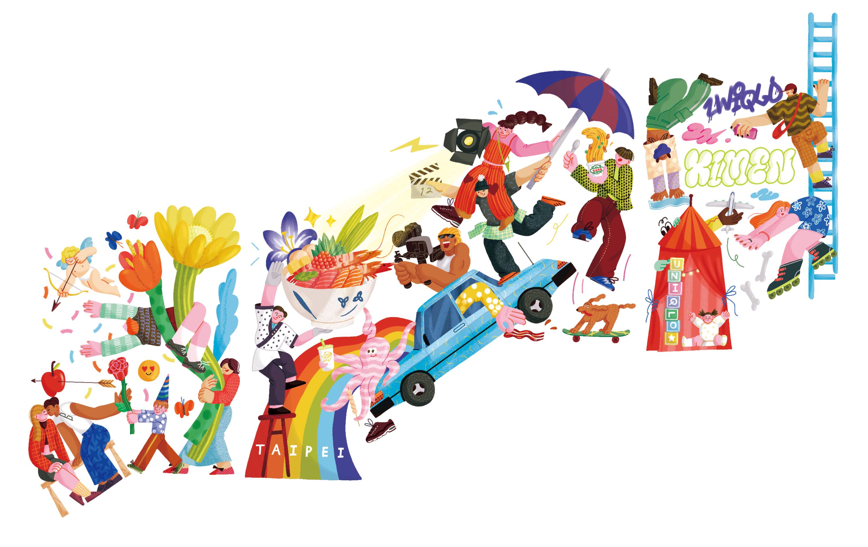 A4:六款在畫草圖的時候就先預設了想要完全不同的方向,讓大家可以有更不一樣的選擇,不過當然主軸都還是圍繞在我經常使用的物件和風格上。由於壁畫以比較多人物來表現西門的精神樣貌,在 UTme! 的圖就想要回到更多自己的樣子一些,所以用幽默的花延伸。無論是像在杯中泡澡的「來一杯下午茶」,或是想像在散步途中,收集到大大小小有趣的植物。這些生活中常被忽略的小事情,放大來看就覺得特別有意思。