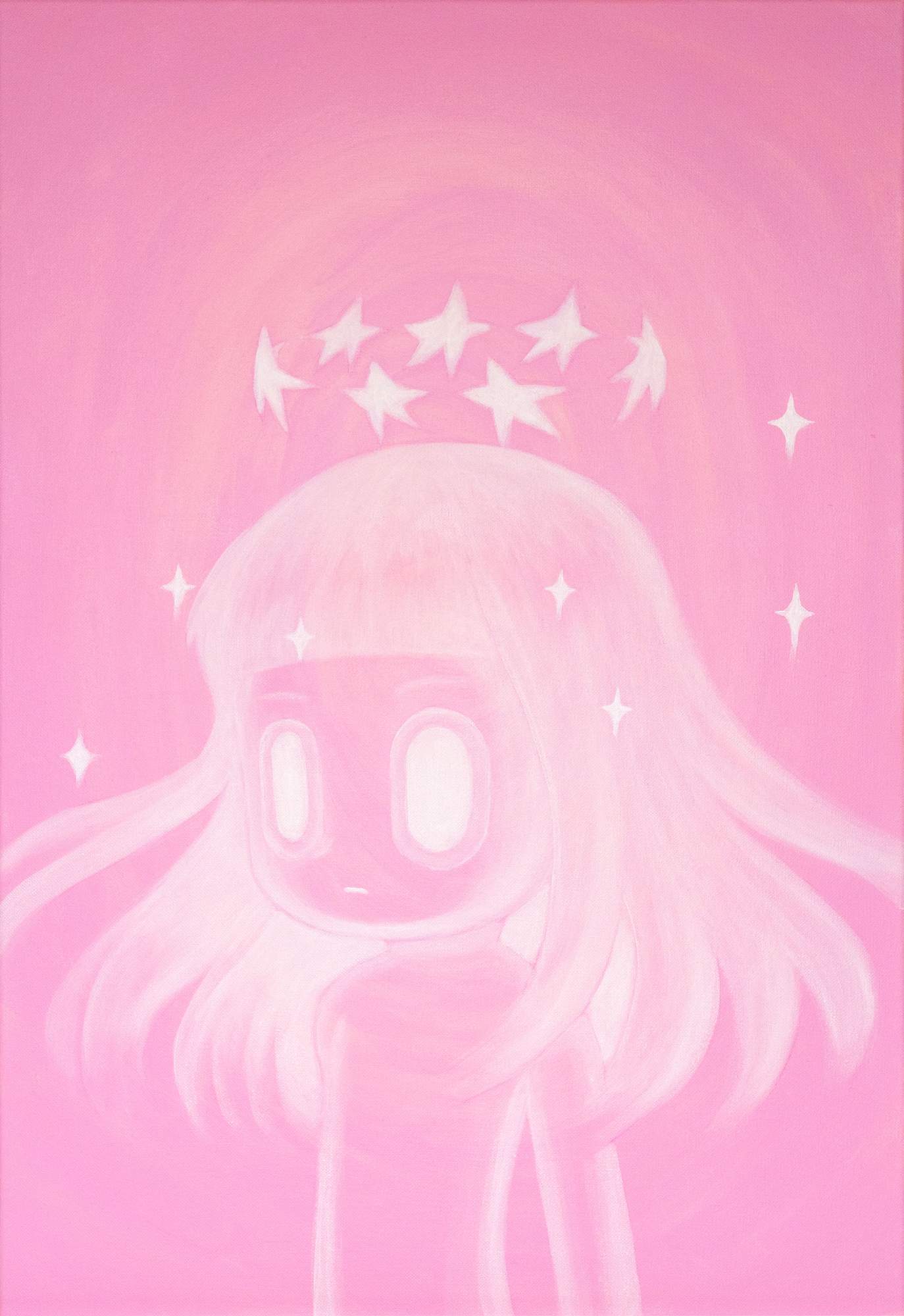 連續三年參加亞洲插畫藝術博覽會從不缺席的消極男子,從第一屆以自身夢境為題的畫作與立體作品、第二屆以《三體》故事啟發為靈感的繪畫系列,2024年消極男子發現自己參觀的眾多展覽,都以探索自我為主軸,他也決定在畫布前回歸自身複雜的心緒,先以色鉛筆粗略勾勒,再透過壓克力與蠟筆詮釋,尤其在〈同甘〉、〈共苦〉兩件作品中可以一窺其心境,繪畫時一方面可以讓他暫時放下生活中的憂惱,貼合著自己的心律動筆,另一方面卻又在停筆後驅使他繼續多方思考,既複雜又矛盾,或許消極男子能在一筆一劃的梳理中,讓心結迎刃而解——然而就算繪畫不能成為生命課題的解答,如果能夠因此引起觀者的共鳴,對他而言也就足夠了。