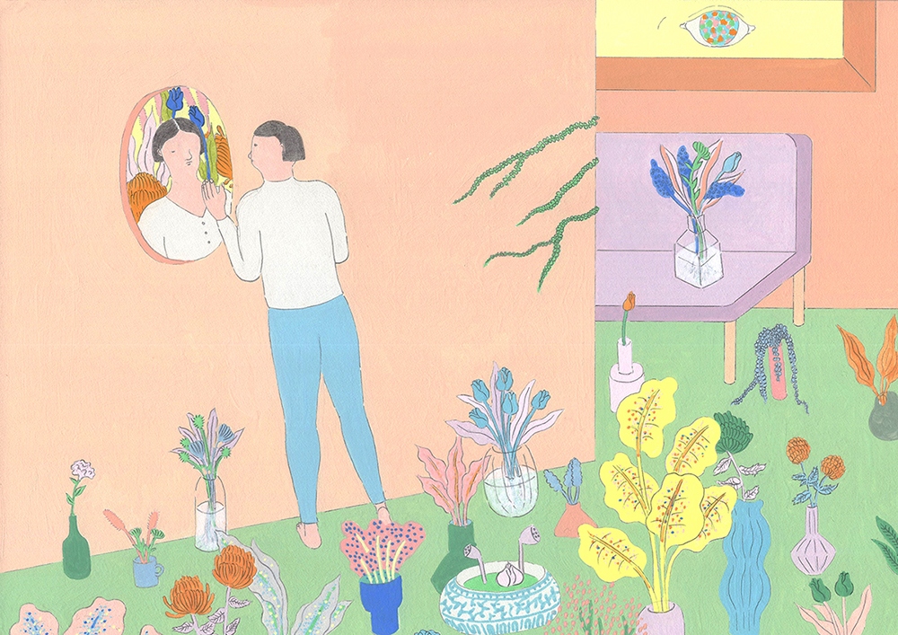 「有太多細密的思緒跟情緒無人訴說、或說了不被理解,我就默默地抒發在創作中。」這是王蟻宣創作意識的開端,他承認這是一個有點寂寞的開始,也讓作品也了幾分受傷的味道。而近期創作伴隨著他自身的自我察覺,達到了比較能夠舒服接受自己的階段,所以畫面也跟著反映出內心,主題上比較多茂盛的花草植物、顏色上也愈偏柔和。