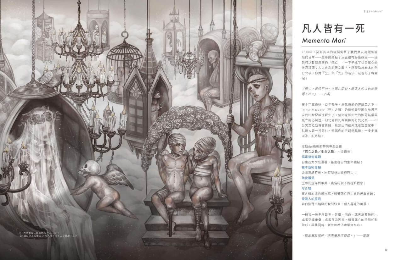 2020年,突如其來的疫情衝擊了我們原以為理所當然的日常──一向以為還有好遠好遠的「死亡」,一下子成了怵目驚心的特寫鏡頭。本期dpi以「生死」為題,讓讀者透過藝術家的視角,體會不同文化對生與死的觀點。將插畫、標本、陶瓷、珍奇櫃與植栽等各式藝術作品作為濾鏡,看見死亡的華美與生命的虛無。